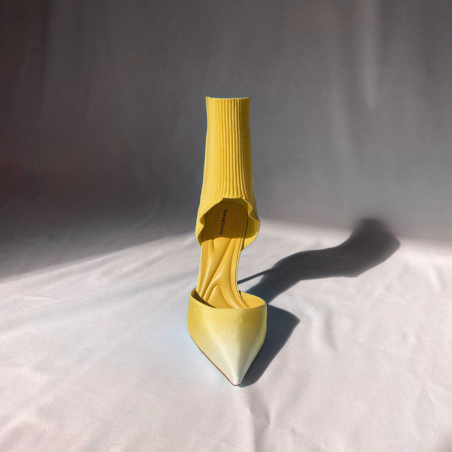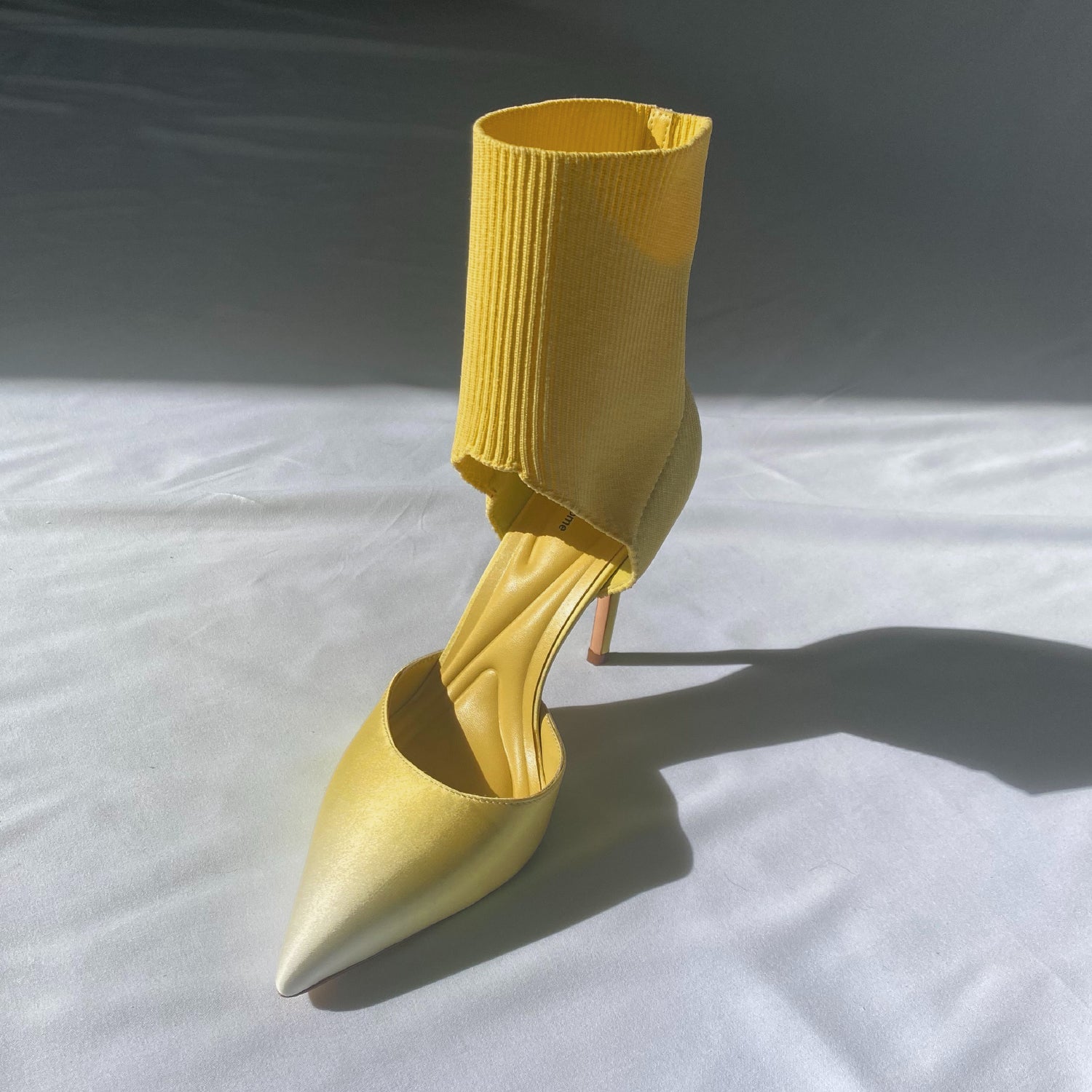 - Knit ankle detail and satin ombré toe combine stability and style, delivering effortless sophistication with comfortable wear.
