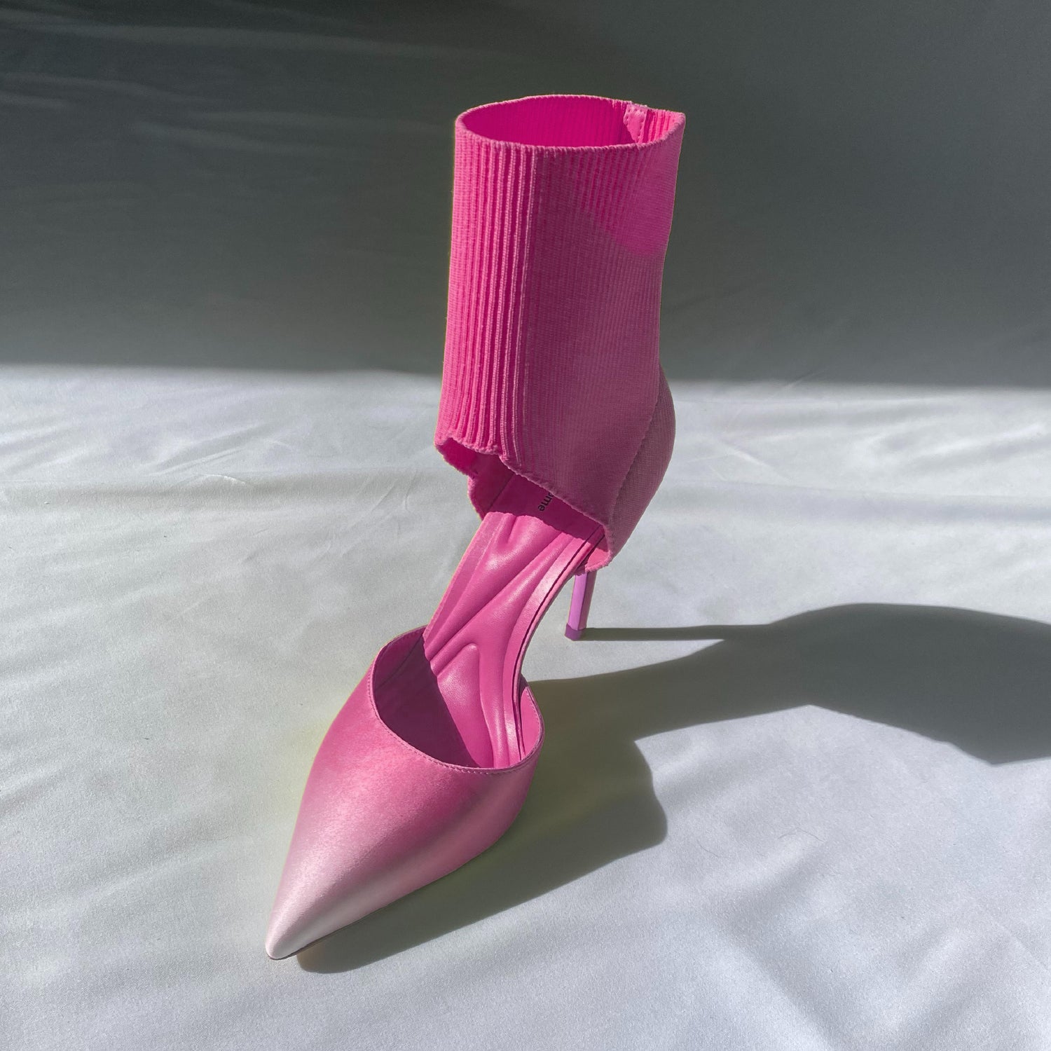 - Knit ankle detail and satin ombré toe combine stability and style, delivering effortless sophistication with comfortable wear.
